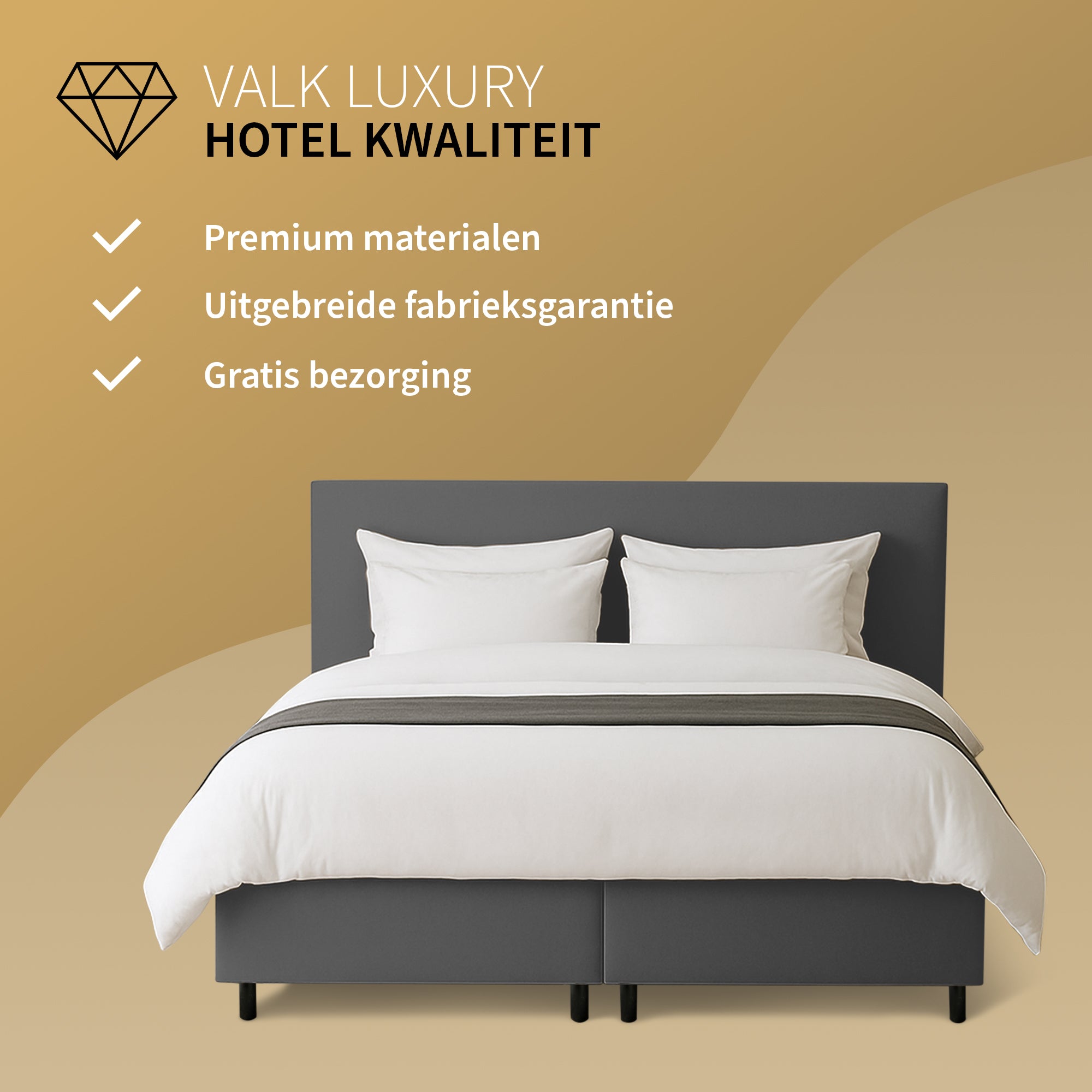 Ervaar elke nacht de perfecte combinatie van stijl en comfort. De Valk Boxspring Set brengt de beleving van een hotelkamer rechtstreeks naar je eigen slaapkamer.